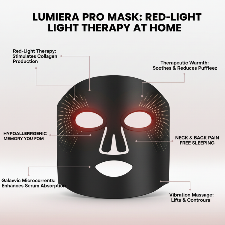 • Red light and warmth target wrinkles and puffiness • Microcurrents and vibration boost hydration and contouring